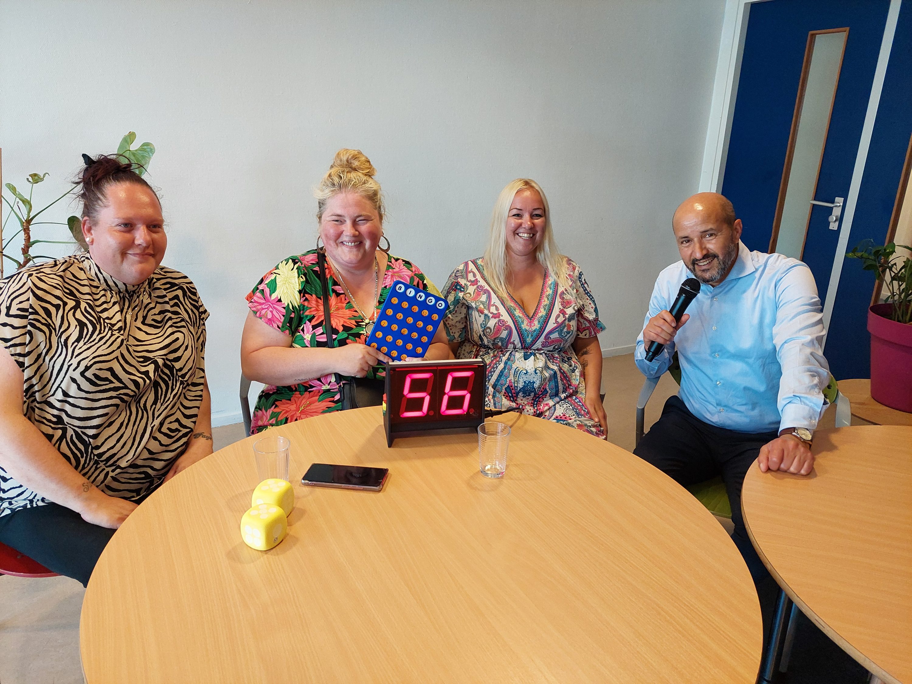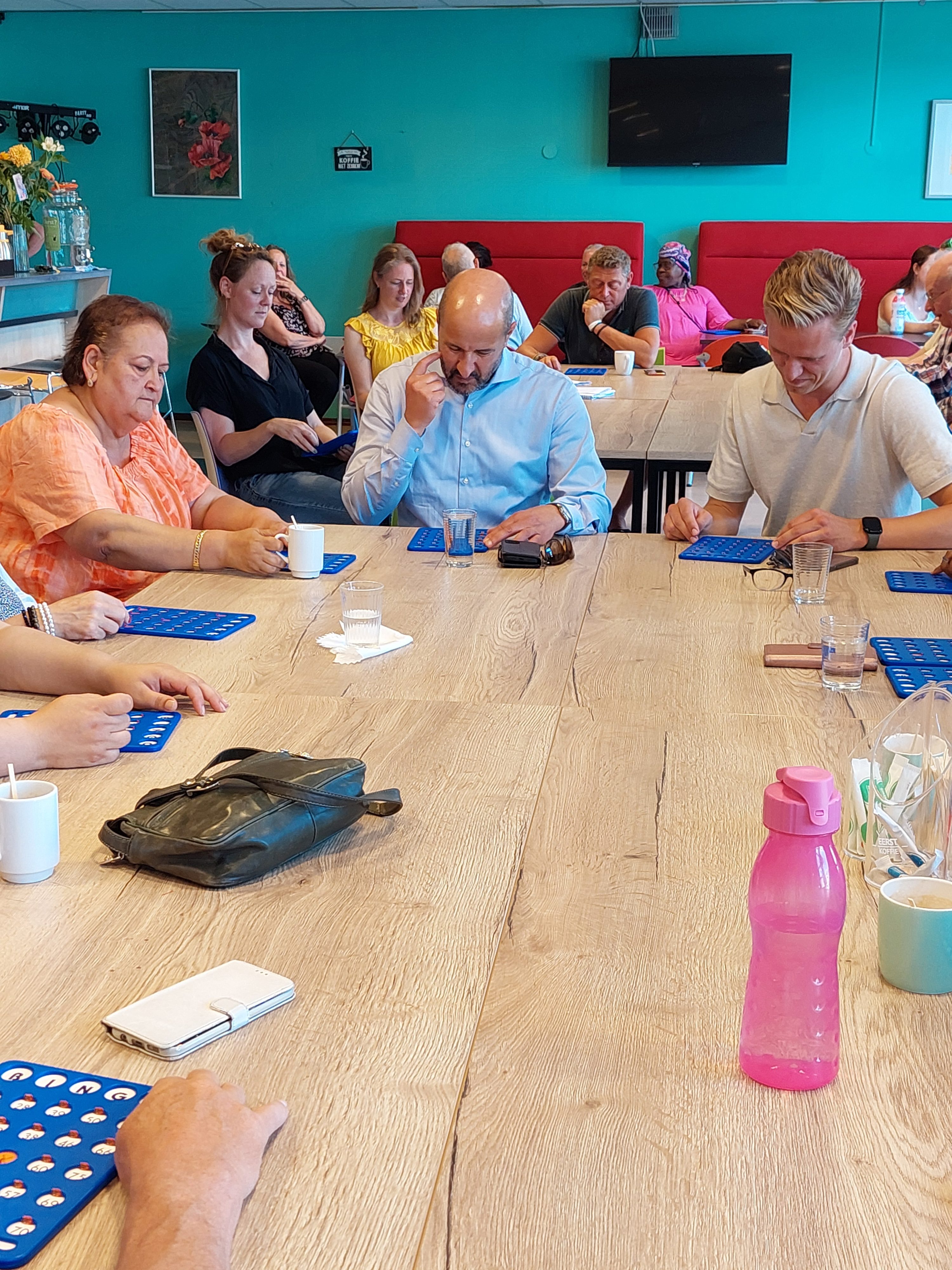 De burgemeester begon zijn bezoek met een potje Bingo. Oktober 2023: moeders Miranda, Krista, Melissa en Nency, Miekie en Piena vonden dat er vanuit wijkcentrum de Symfonie te weinig activiteiten voor jonge kinderen georganiseerd werden. Samen met het kinder- en jongerenwerk van Rijnstad zijn ze begonnen met een Halloweenfeest. Nu is er elke maand een disco of andere activiteit, inmiddels voor alle leeftijden. Ze zijn vorig weekend nog met 178 buurtbewoners naar Hellendoorn geweest. En elke maand organiseren ze een Bingo; de kaarten zijn binnen twee dagen vergeven. Tussen de nummers door vertelden de moeders over de samenhang die ontstaan is. Helaas geen prijs voor de burgemeester.
