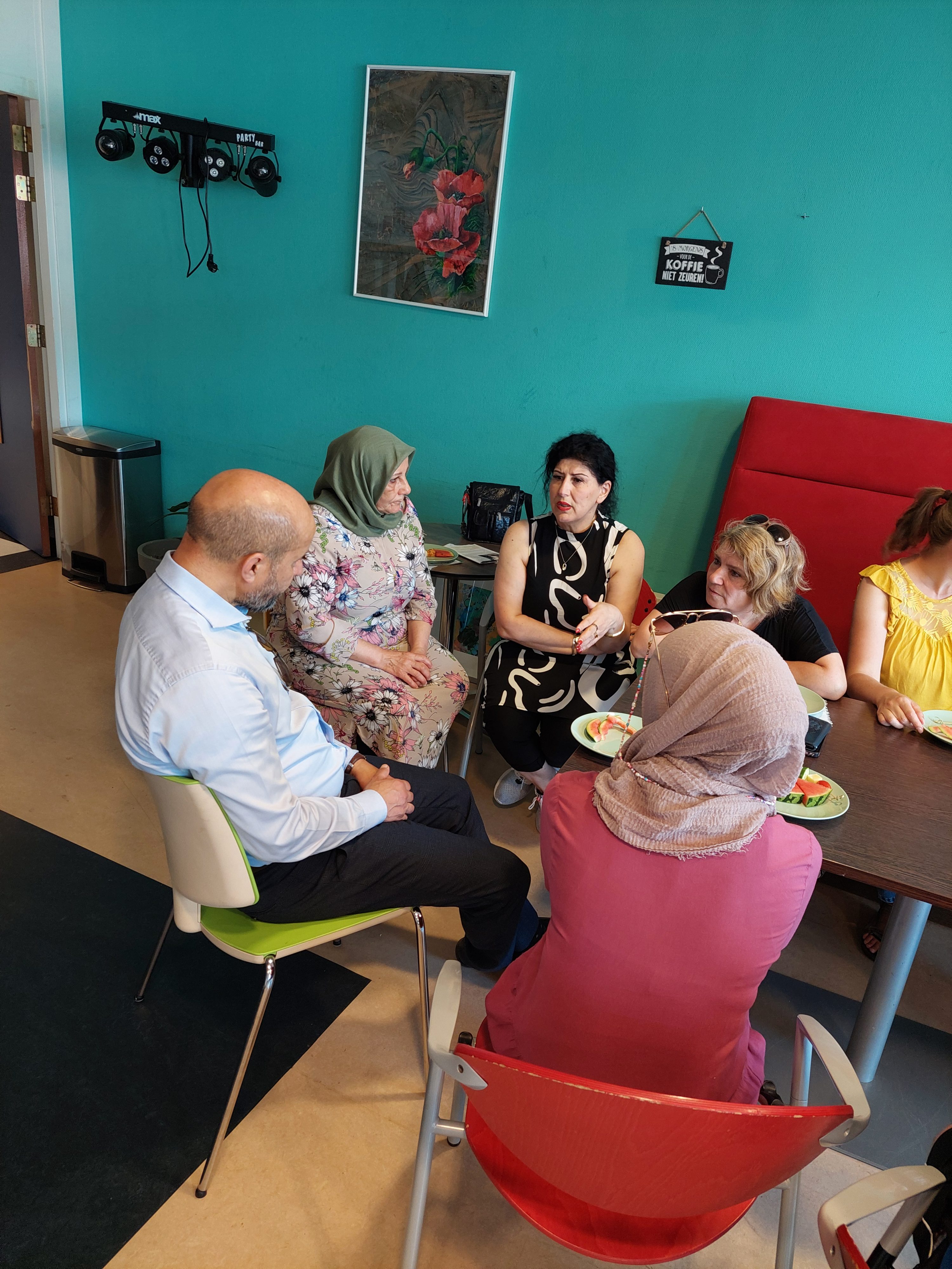 De kinder- en jongerenwerkers van Rijnstad vertellen de burgemeester over de activiteiten en de verbindingen die ze leggen met ouders en met de 2 scholen in de buurt.